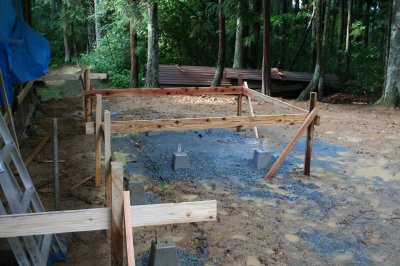 | なかなか明けない梅雨空の下、足尾山御祖神社本殿の基礎工事が行われました。 |