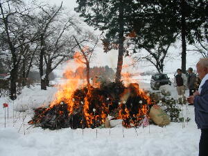最近、ゴミの処理に対する規制が厳しくなり、本来神社や神棚とは全く無関係のものが「古札納め所」に目立つようになってきました。お人形や香炉などの仏具はもちろんのこと、時にはバラバラにした仏壇や古い位牌が入っている事もあります。神社では「焼納祭」「どんと祭」などの祭儀を執り行ってお焚き上げしておりますが、なんでもかんでも燃やせるわけではありません。神社でのお焚き上げは、宗教行事として特別に認められた「野焼き」です。当然ダイオキシンの発生が懸念されるわけですから、神社や神棚とは関係の無いものについては、出来るだけ持ち込まぬようお願い致します。また、仏具の処理については是非、お寺の方にご相談いただくようお願いします。