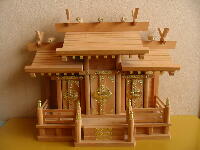 | この形は、実は伊勢神宮の正宮(しょうぐう)の作りである神明作りを基本にした形なのです。神棚の中央には伊勢神宮の内宮(ないくうと読みます)のお札である「天照皇大神宮」を納めますから至極当然な事ではあります。「神棚の主」である神様に合わせて作ったのが、この形の神棚ですから「天照皇大神宮」を納めないという事になると、「家は作ってみたけれど住まわしてもらえない」という全くマヌケな事態になってしまいます。 |