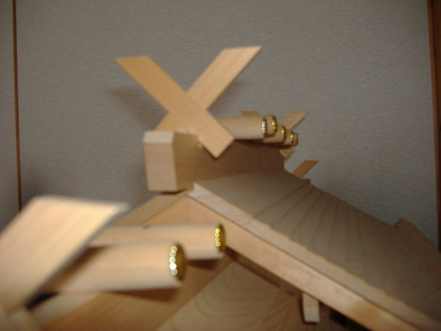神棚は「天照皇大神宮」を中心にして御札を納めますから、伊勢神宮の正宮(しょうぐう)の作りである神明作りをまねて作られているものが多数です。この構造は古代の倉の構造を受け継いでおり、屋根を支える構造材を交叉した部分で切らずに、天に突き出させたものが千木になったとされています。後の世になって神社建築特有の「飾り」として変化し、神棚に付いているような「置き千木」が生まれました。 |