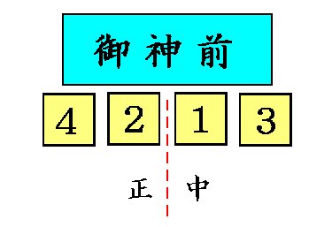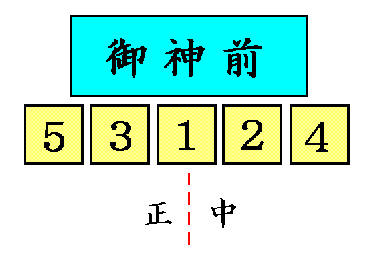 | 奇数の場合、正中、次いで左(神様からみて)、次いで右という順番でお供えします。 | 偶数の場合、正中をはさんで左(神様からみて)、次いで右という順番でお供えします。 |