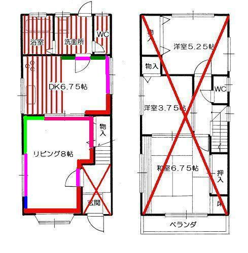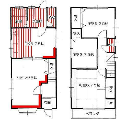に真上部分が洋室の中ほどにあたり、物は置けそうにありません。 西側については、二階部分も壁際となっており家具を置くことが可能です。