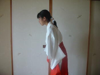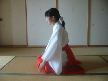 を行います。 正座しているときは正座のまま、椅子に座って いるときは立ち上がって行います。神前に遠い足 より神前に進みます。 |