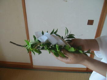 っている場所よりも上位(枝の先端に近い方)を執 ります。 床や畳に正座しているときは座ったまま、椅子 に座っているときは起立して受取ります。 神職は玉串を渡したあと、小揖(軽いおじぎ・角 度は15度)をしますが、答礼して小揖する必要は ありません。 |
