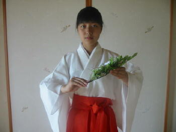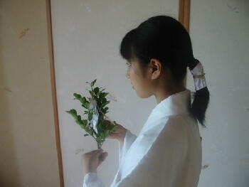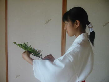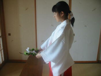に胸の高さに持ちます。 小揖(軽いおじぎ・角度は15度)をしてから神前 に進みます。 |