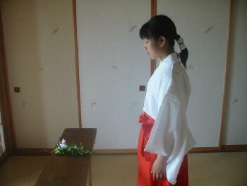 右足から一歩退き、神前での拝礼を行います。 |