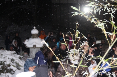本年は降雪の中での正月となり、何年かぶりに数回の除雪が必要となりました。元日には午前零時からの歳旦祭、続いて恒例のみかんまきが執り行なわれました。3日には午前10時から新春祈願祭が執り行われ、皆様の交通安全・家内安全・営業繁栄などをご祈願申し上げました。15日にはどんと祭が執り行われました
