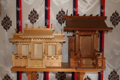 | 現在の神棚に氏神様(お近くの神社)の御神札が納められない方は、更新際に是非氏神様の御神札が納められる物にしてください。神棚は御神札を納めるためのものです。大切かつ一番身近な氏神様の御神札が納まらないのでは意味がありません。 |