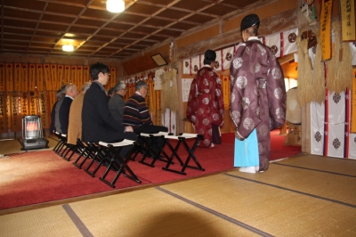 本年は降雪の中での正月となり、何年かぶりに数回の除雪が必要となりました。元日には午前零時からの歳旦祭、続いて恒例のみかんまきが執り行なわれました。3日には午前10時から新春祈願祭が執り行われ、皆様の交通安全・家内安全・営業繁栄などをご祈願申し上げました。15日にはどんと祭が執り行われました